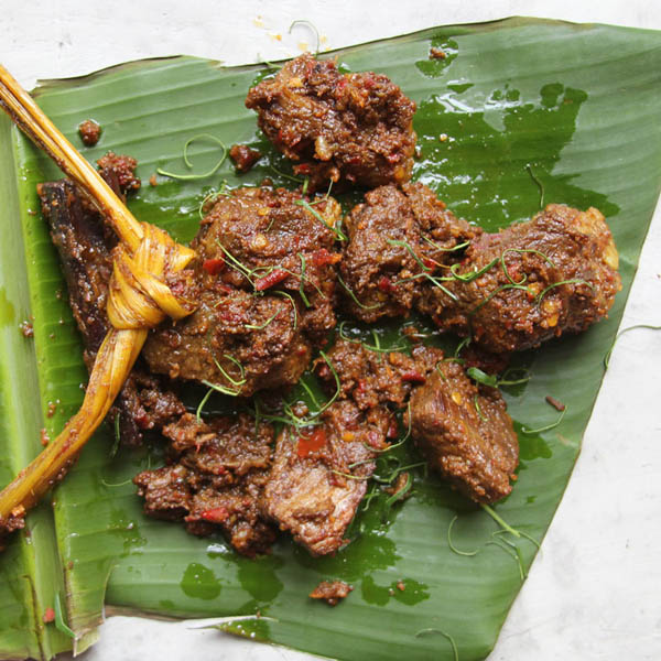 Add 7 lime leaves, lemongrass knots, cinnamon, coconut milk, and salt; bring to a boil. Reduce heat to medium-low; cook, stirring occasionally to prevent coconut milk from scorching, until the consistency of thick pea soup, about 1½ hours. Continue to cook, stirring frequently to prevent burning, until sauce and beef turn a dark caramel color and the sauce coats the beef, 2½-3 hours. Discard whole spices before serving; garnish with thinly sliced lime leaves.