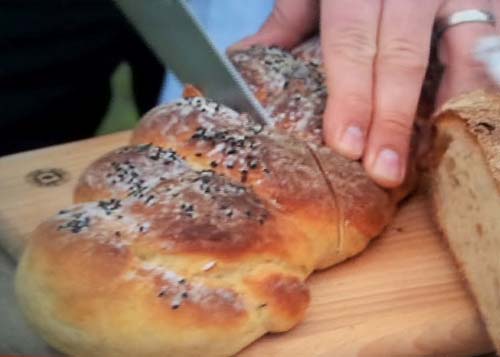 Preheat the oven to 220°C/Fan 200°C/Gas 7. Score the dough with a knife along the pinched join and sprinkle the top with the onion seeds. Bake the loaf in the centre of the oven for 35 minutes until well risen and crusty on top. Cool on a wire rack.
