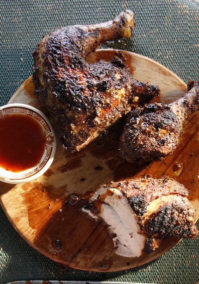 2. Build a medium-hot fire in a charcoal grill or heat a gas grill to medium. (Alternatively, heat a cast-iron grill pan over medium-high heat.) Add chicken, skin side down; cook, turning once, until marinade forms a crust on the outside, about 8 minutes. Cover grill; continue cooking until cooked through, about 40 minutes. (Alternatively, transfer chicken to a foil-lined baking sheet; bake in a 350° oven until done.)