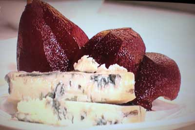 Reduce red wine to a syrup and spoon over pears, serve with room temperature gorgonzola.