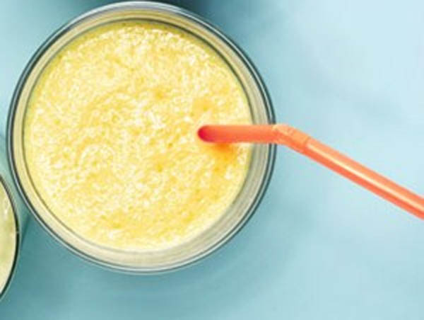 Blend 100g pineapple, cubed; 75g frozen mango; 180ml vanilla soy milk; and 3 tbsp low-fat cottage cheese. Garnish with 1/4 tsp unsweetened coconut flakes