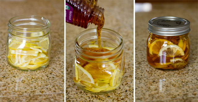 Thinly slice the lemon and peel and thinly slice or mince the ginger (I used between 1-2 tsp of minced ginger, you can use your judgement about how much you’d like). I cut the slices into quarters to help them break down faster in the honey. Arrange the lemons (take out the seeds first) and ginger in layers in a clean, sterile jar and cover with honey. Refrigerate until needed. Use a large tbsp of the mixture in a mug of hot water to make tea.