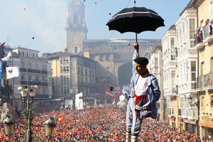 The festival begins at 6pm with the ringing of the bells of the Church of San Miguel and the traditional “chupinazo”, a rocket firework which is let off to mark the beginning of the festivals in honour of the Virgen Blanca. The “bajada del Celedón” – a life-size doll dressed in the traditional costume of this region and carrying a haversack, wineskin and umbrella, descends from the bell tower of the Church of San Miguel to the balcony of a house in the Plaza de la Virgen Blanca, apparently by means of an umbrella (Mary Poppins stylee). As Celedón descends over the Square, thousands of bottles of champagne are opened, cigars are lit and txistu and drums sound. Dressed in the traditional Alava shirt and red neck tie, on reaching the balcony, the puppet suddenly vanishes and is replaced by a real man, causing a tremendous roar from the square below.